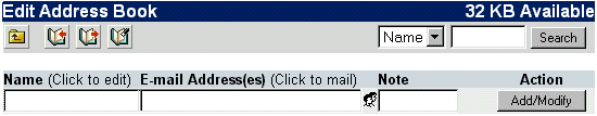 Obviously, your first action will be to add an entry (Note: There may be preset entries already in there that set been set by the system administrator). Simply click within the Name text field, and enter the necessary information. Use the "Tab" key on the keyboard to jump to the next field. You can also add a note to easily remember the contact by. Once you are finished entering the information, click Add/Modify. You can now access this quickly for sending. Once you have all your e-mail addresses in place, you may want to edit them later. To edit an entry, click the Name of the entry, and it will appear in the editing area above. You can click within the text field of the entry information you wish to edit and type what you wish. Once you are finished editing the entry, click Add/Modify. You can delete entries by simply clicking the Delete button to the absolute right side of the entry you wish to delete. You may also want to delete all the entries, but deleting them all separately can be tedious. Fortunately, all you have to do is click the "Clear All Addresses" button (