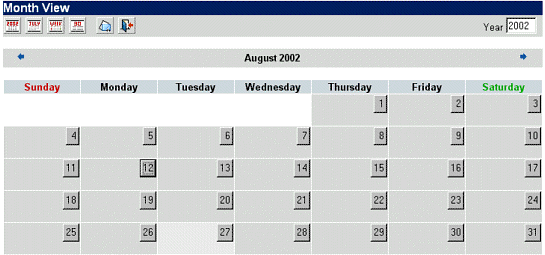 To view a specific day, you can click its corresponding number. This will take you to the times and events for that day. You'll notice that there is also a specific toolbar for the calendar. see The Calendar Toolbar for more information.