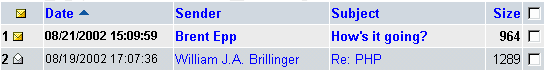 The first column represents the status of the message. The golden, closed envelope specifies that the message has not been read. Notice that all of the text in that row (of the first message) is also bolded. The envelope in the second message row is white and opened. This means that you have read that message. Also take note that the text in the second message row is in plain format (not bolded). You can change the status of the message by clicking the envelope next to the message you wish to change. If the status is Read, it will be changed to Unread, and vice-versa. The second column is the Date of which you received the e-mail. The date format, in this case, is MM/DD/YY (see Configuring Display Settings to learn how to change the date format). It also tells you the time at which you received the message. In this case, it is in a 24-hour format. This can be changed in the Display Settings Configuration . The Sender is who the e-mail is from. You can click the name to compose a message to that person (see Message Composition ). The Subject is the topic of which the sender had specified. This gives you a brief, explanatory meaning of the message. By clicking the Subject of the message, you will be redirected to that message. For example, if a user clicked How's it going? (see above diagram), he/she would be redirected to that message, and be able to read the message, in full. The Size of the message is the virtual size that the message takes up on the server. This is reported in Bytes . The Checkbox in the last column is for message selection and actions. By clicking one of the checkboxes, a small Checkmark will appear in the box. Clicking it again removes the checkmark. By clicking the checkbox utmost to the top (directly right of "Size"), all of the checkboxes below it will be selected. This tool is for performing actions on selected messages. More will be discussed on this topic in Using the Toolbar. |